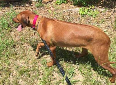 Toby was our Christmas present, born on Christmas day. He is an intelligent, protective, and sweet boy. He loves following us around and has a tender-hearted personality. He is responsive to the most gentle of voice commands and always tries to do what he thinks we want. He is protective of us and our home and will not let a stranger near the front door until he knows they are supposed to be there. He loves hunting and will go after squirrels, moles, opossums, and any other small animal that has the ill-fate of finding it's way onto the property. He has a very strong prey instinct. He is, however, good with cats since he was raised with them. This is a good example of how Ridgebacks are able to adjust to their individual homes! Toby also loves to play in water. He is a direct descendant of one of the older kennels in South Africa. His African heritage shows in his deep red color and stocky bone structure. He produces puppies that are a deep red.